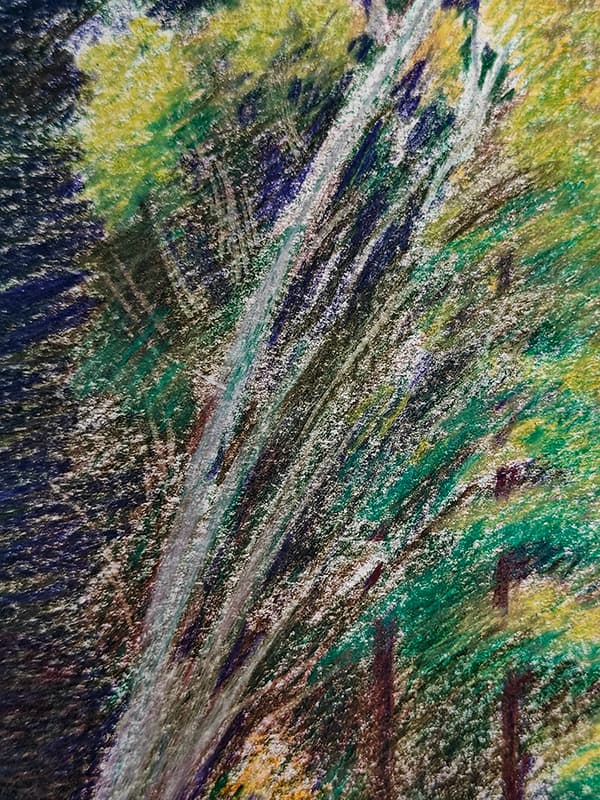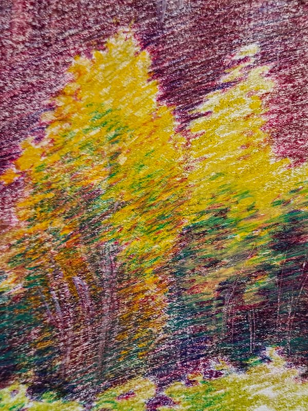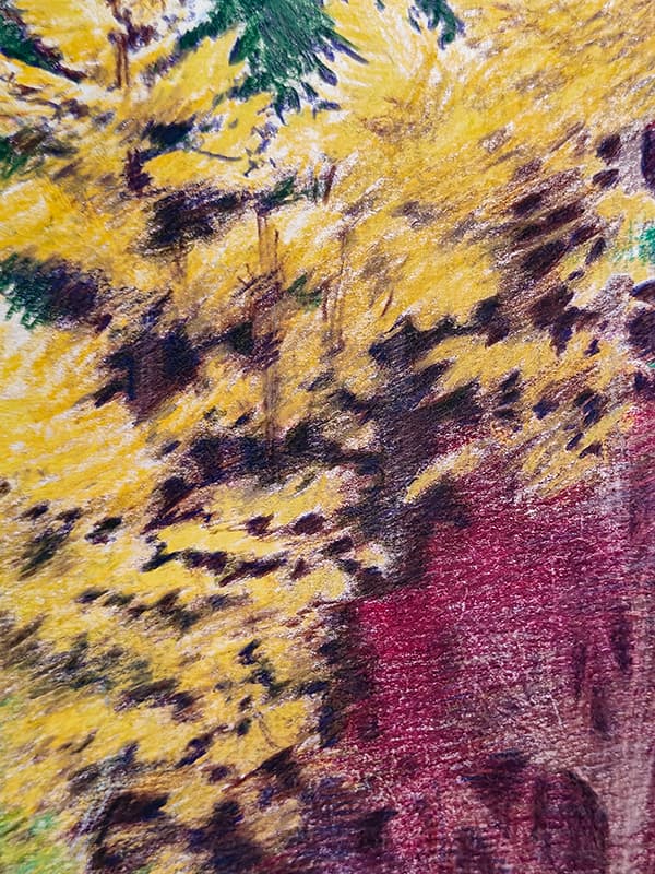 Na het geel, selecteer ik mijn andere kleuren. Groen is evident. Met alle groene potloden in de aanslag overloop ik nogmaals de foto en test welke groentint gepast is voor de naaldbomen. Opnieuw start ik vanuit een vage indicatie om de bomen een plaats te geven om nadien met gerichte bewegingen de takken aan te geven. Telkens ik een bepaalde beweging in de pols of in de vingers heb die een interessant effect opleverd, herhaal ik die onmiddellijk op andere plaatsen waar ik dat zelfde effect wil. Dat doe ik nu voor de naaldtakken.
