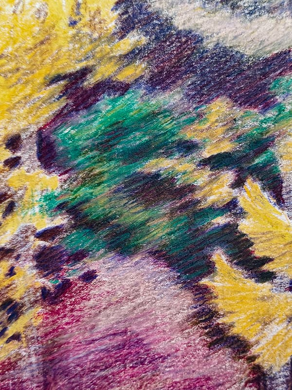 Op verschillende plaatsen in de tekening experimenteer ik met de mogelijkheden van mijn materiaal en de kleuren. Het is steeds mijn bedoeling speelruimte te laten. Waar ik nog niet zeker van ben, laat ik open. Hier en daar voeg ik subtiel kleur toe, al dan niet in een specifieke vorm of richting. Ik weet dat de eerste laag die ik zet belangrijk is. Een te dikke eerste laag maakt die kleur bepalend. Zeker donkere kleuren zijn moeilijk lichter te maken. Om effecten van licht te creëren, is een dikke laag van een felle kleur dan weer interessant. Op die manier kan een donkere bovenlaag weg geschraapt worden. Soms is een donkere onderlaag dan weer net wat ik wil om tot een tussentoon te mengen.